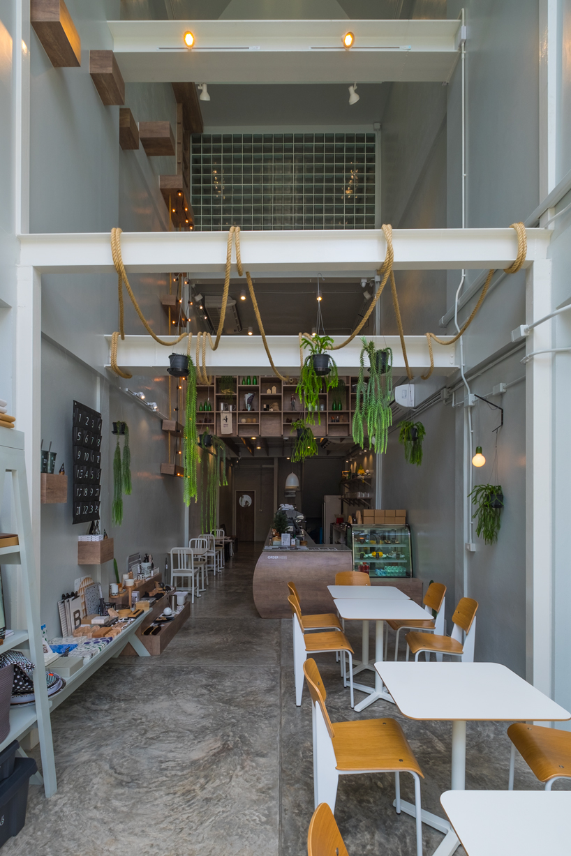 architecture in thailand: party / space / design is a bangkok-based studio with more than ten years of experience inarchitecture, interior, graphic, and exhibition design. ‘thinkin’ outside the fox’ is a local café that they designed, starting from the idea of thinking outside the box—in reference to the café’s name. this premise encouraged them to start from scratch and break all the rules of interior design. located in a 3-story commercial building, the concept visualized the space as several stackable boxes, leading the team to restructure the building to make it look spacious and airy.
