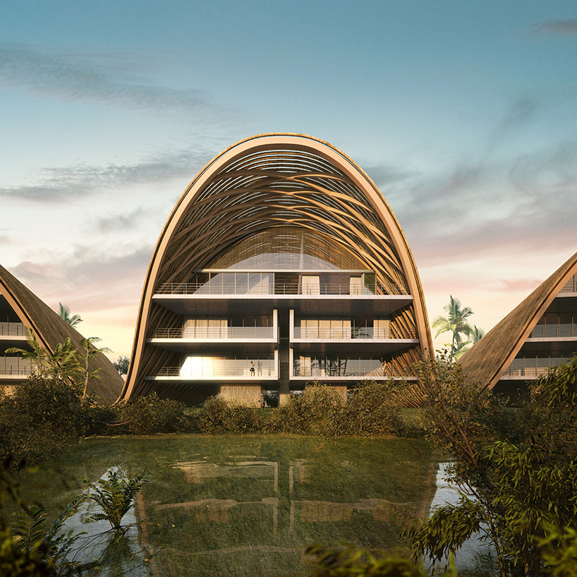 the development is characterized by a defined curve that arises from sordo madaleno arquitectos’ reinterpretation of the traditional palapa huts found in the region. ‘the purpose of this element — apart from its aesthetic qualities — is to provide a comprehensive architectural solution,’ explains the design team. ‘more than just an outer lining, it is a whole: a structural element that protects from excessive insulation while letting in natural light in a controlled manner, and encouraging natural cross ventilation that takes advantage of the breezes.’